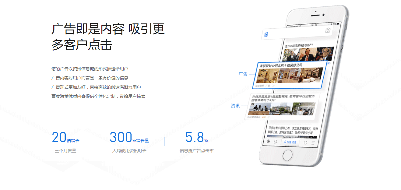 信息流推广是在百度APP、百度首页、贴吧、百度手机浏览器等平台的资讯流中穿插展现的原生广告,广告即是内容。